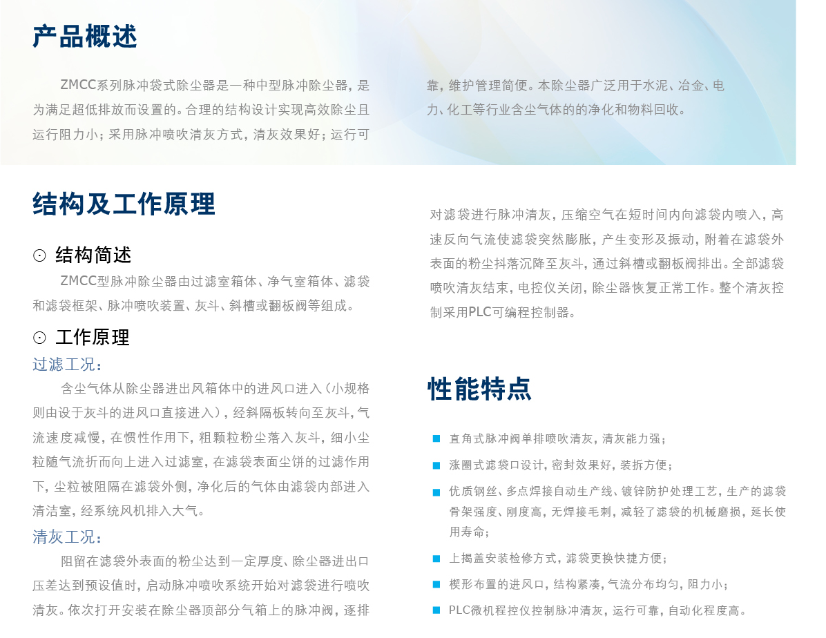 ZMCC系列脉冲袋式除尘器是一种中型脉冲除尘器,是为满足超低排放而设置的。合理的结构设计实现高效除尘且运行阻力小;采用脉冲喷吹清灰方式,清灰效果好;运行可靠,维护管理简便。本除尘器广泛用于水泥、冶金、电力、化工等行业含尘气体的的净化和物料回收。
